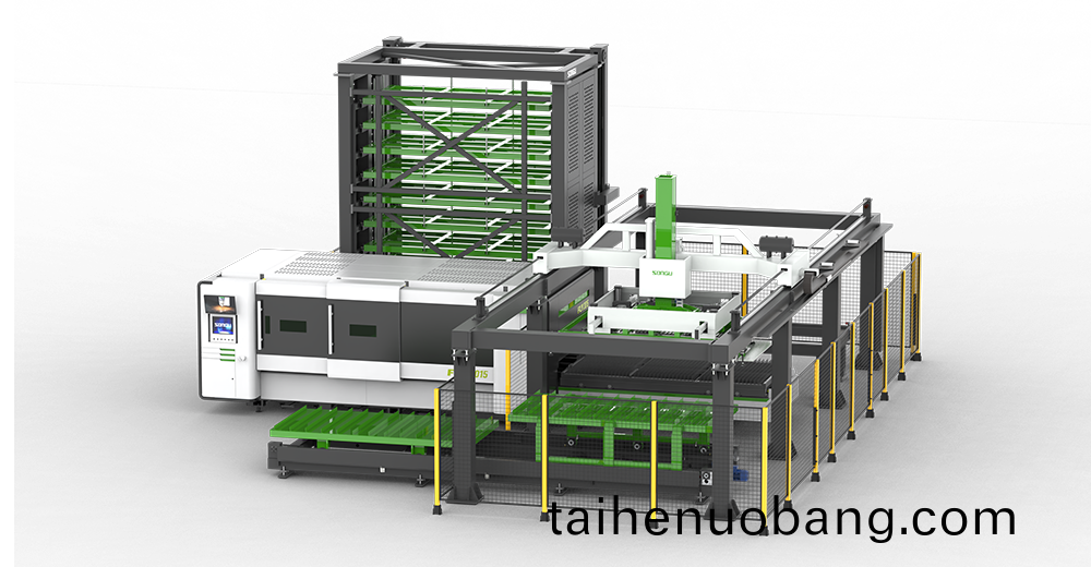 在鬆穀激光切割機的切割平檯上搭載 HyStore 係列自動上下料及倉儲係統,通過輭件控製係統進(jin)行串聯控製,實現無(wu)人值守的全自動化智(zhi)能激(ji)光(guang)切割生(sheng)産線;